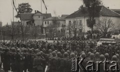 12.05.1936, Wilno, Polska. Uroczystość złożenia serca Marszałka Józefa Piłsudskiego oraz Marii Piłsudskiej z Billewiczów we wspólnym grobie na cmentarzu na Rossie. Ustawieni w dwuszeregu żołnierze obserwują przejazd konduktu pogrzebowego. Fot. NN, zbiory Ośrodka KARTA, kolekcję zdjęć przekazał Marcin Jabłoński.