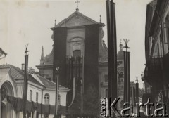 12.05.1936, Wilno, Polska. Uroczystość złożenia serca Marszałka Józefa Piłsudskiego oraz Marii Piłsudskiej z Billewiczów we wspólnym grobie na cmentarzu na Rossie. Widok na kościół św. Piotra i Pawła na Antokolu. Na pierwszym planie - przechodnie, przejeżdżające dorożki oraz brama kościelna. Fot. NN, zbiory Ośrodka KARTA, kolekcję zdjęć przekazał Marcin Jabłoński.