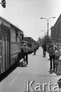 3-5.08.1981, Warszawa, Polska. Blokada ronda na skrzyżowaniu ulicy Marszałkowskiej i Alei Jerozolimskich. Kierowcy autobusów miejskich i ciężarówek w ten sposób protestowali przeciwko obniżce kartkowych przydziałów mięsa i trudnościom zaopatrzeniowym. Strajk został zorganizowany przez Zarząd Regionu Mazowsze NSZZ "Solidarność". Fot. Tomasz Tomaszewski, zbiory Ośrodka KARTA