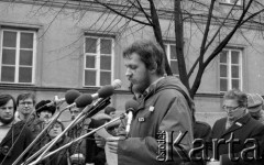 Marzec 1981, Warszawa, Polska. Obchody rocznicy Marca '68 na Uniwersytecie Warszawskim - odsłonięcie na ścianie Pałacu Uruskich (Czetwertyńskich) tablicy upamiętniającej wiec studentów domagających się wolności słowa w marcu 1968. Przemówienie Andrzeja Walewskiego. Na drugim planie widoczni są, od prawej strony: Kazimierz Dobrowolski i Maciej Geller. Fot. NN, zbiory Ośrodka KARTA/Independent Polish Agency (IPA) przekazał Józef Lebenbaum