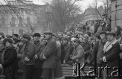 8.03.1981, Warszawa, Polska. Obchody rocznicy Marca'68 na Uniwersytecie Warszawskim - uroczystość wmurowania w ścianę Pałacu Uruskich (Czetwertyńskich) aktu erekcyjnego pod tablicę upamiętniającą wiec studentów domagających się wolności słowa w marcu 1968. Na prawo stoi profesor Tadeusz Jaroszewski (?). W tle widoczny jest gmach Wydziału Prawa. Fot. NN, zbiory Ośrodka KARTA/Independent Polish Agency (IPA) przekazał Józef Lebenbaum