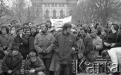 8.03.1981, Warszawa, Polska. Obchody rocznicy Marca'68 na Uniwersytecie Warszawskim - uroczystość wmurowania w ścianę Pałacu Uruskich (Czetwertyńskich) aktu erekcyjnego pod tablicę upamiętniającą wiec studentów domagających się wolności słowa w marcu 1968. Przemówienie Zbigniewa Rykowskiego, przewodniczącego Zarządu Samorządu Studentów UW. Po prawej stronie stoi profesor Jerzy Mycielski. Fot. NN, zbiory Ośrodka KARTA/Independent Polish Agency (IPA) przekazał Józef Lebenbaum