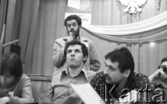 23-24.03.1981, Bydgoszcz, Polska. Posiedzenie Krajowej Komisji Porozumiewawczej NSZZ "Solidarność", które obyło się kilka dni po tzw. wydarzeniach bydgoskich. Na zdjęciu: przemawia Andrzej Gwiazda, na pierwszym planie siedzą Zbigniew Bujak, Ryszard Kalinowski z fajką. W tle zawieszona flaga, godło i tabliczki z napisem: "Solidarność" i "NSZZ". Fot. NN, zbiory Ośrodka KARTA/Independent Polish Agency (IPA), przekazał Józef Lebenbaum