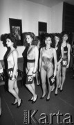 Luty-marzec 1989, Warszawa, Polska. Wstępne eliminacje do półfinału wyborów Miss Polonia 1989, dziewczyny w kostiumach kąpielowych na scenie. Fot. Jarosław Tarań, zbiory Ośrodka KARTA [89-17]