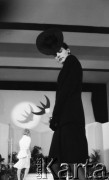 Grudzień 1988, Warszawa, Polska. "Moda Polska", pokaz modeli z kolekcji wiosna-lato 1989, modelka w krótkiej sukience i kapeluszu z szerokim rondem. Fot. Jarosław Tarań, zbiory Ośrodka KARTA [88-61]