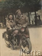 8.05.1945, Dicomano, Włochy. Silvia Valli i Stefan Szymula w dniu ślubu. S. Szymula przed wojną pracował w Powiatowym Zarządzie Drogowym w Buczaczu, po 1939 ukrywał się. Aresztowany po nieudanej ucieczce do Rumunii, osadzony w więzieniu w Czortkowie, później w Starobielsku. Skazany na 5 lat obozu, zesłany w styczniu 1941 roku na Syberię. Dostał się do Armii Andersa, z którą został ewakuowany do Iranu. Przeszedł z nią cały szlak bliskowschodni. W Palestynie ukończył Szkołę Podchorążych Piechoty Rezerwy i został mianowany porucznikiem. Walczył pod Monte Cassino. W 1948 roku emigrował z żoną i synkiem do Argentyny. Fot. NN, zbiory Silvii Szymuli, reprodukcje cyfrowe w Bibliotece Polskiej im. Ignacego Domeyki w Buenos Aires (Biblioteca Polaca Ignacio Domeyko) i w Ośrodku KARTA w Warszawie