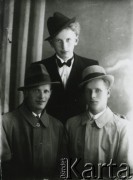 Druga połowa lat 30. do 1941, Kozienice, Polska. Portret trzech młodych mężczyzn w kapeluszach. Zdjęcie wykonane w atelier fotograficznym żydowskiego fotografa Chaima Bernemana. Przed wojną zakład mieścił się w Kozienicach na rogu ulic Warszawskiej i Maciejowickiej, przed wybuchem wojny albo już w czasie niemieckiej okupacji został przeniesiony na ulicę Lubelską 13. Cała kolekcja jest datowana na okres od drugiej połowy lat 30-tych do roku 1941, kiedy Chaim Berneman wraz z rodziną został zesłany do obozu pracy w Wolanowie. Berneman zmarł po ucieczce z obozu. Fot. Chaim Berneman (Chaim Berman), zbiory Ośrodka KARTA