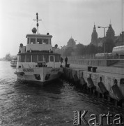Lipiec 1957, Warszawa, Polska. Statek wycieczkowy "Jarosław Dąbrowski" cumuje przy wiślanym nabrzeżu, w tle Stadion Dziesięciolecia. Fot. Romuald Broniarek, zbiory Ośrodka KARTA