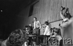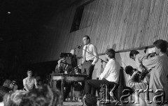 6.06.1981, Warszawa, Polska. Wizyta Czesława Miłosza w Polsce po otrzymaniu Literackiej Nagrody Nobla - spotkanie z czytelnikami w Centralnym Klubie Studentów Politechniki Warszawskiej "Stodoła". Widok z góry na uczestników spotkania oraz noblistę prezentującego swoją twórczość. Fot. NN, zbiory Ośrodka KARTA/Independent Polish Agency (IPA) przekazał Józef Lebenbaum