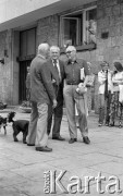 8.06.1981, Warszawa, Polska. Wizyta Czesława Miłosza w Polsce po otrzymaniu Literackiej Nagrody Nobla - czytelnicy przed siedzibą wydawnictwa "Czytelnik". Psa prowadzi Karol Małcużyński, dziennikarz i publicysta. Fot. NN, zbiory Ośrodka KARTA/Independent Polish Agency (IPA) przekazał Józef Lebenbaum