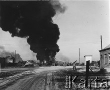 1.01.1945, St Denijs Westerm k/ Gandawy, Belgia. Lotnisko sił alianckich zbombardowane przez Niemców, płonące samoloty amerykańskie typu "Liberator". Fot. Jan Sianos, zbiory Ośrodka KARTA, udostępnili Scholastyka i Jerzy Królowie