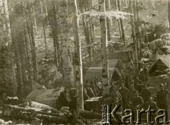Lata 60., Polska. Grupa osób w obozie taternickim w górach. Fot. Irena Jarosińska, zbiory Ośrodka KARTA