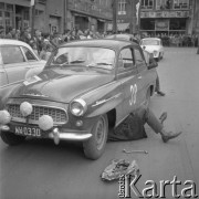 Wrzesien 1962, Rybnik, Polska. Międzynarodowy Rajd Przyjaźni, zepsuty samochód marki "Skoda", pod którym leży jeden z zawodników. Fot. Kazimierz Seko, zbiory Ośrodka KARTA