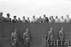 Lipiec 1959, Katowice, Polska. Obchody piętnastolecia PRL, przedstawiciele polskich i radzieckich władz oglądają występy Zespołu Pieśni i Tańca Śląsk. W dolnej loży stoją m.in.: Nikita Chruszczow, Władysław Gomułka i Edward Gierek. Fot. Romuald Broniarek/KARTA