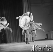Lipiec 1959, Katowice, Polska. Teatr Śląski, występ zespołu "Śląsk" z racji wizyty na Śląsku I sekretarza KC KPZR Nikity Chruszczowa przybywającego na obchody piętnastolecia PRL. Artyści w strojach regionalnych tańczą na scenie. Fot. Romuald Broniarek/KARTA