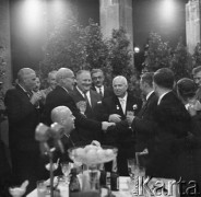 Lipiec 1959, Warszawa, Polska. Na zakończenie kilkudniowej wizyty I sekretarza KC KPZR Nikity Chruszczowa ambasada radziecka wydała przyjęcie pożegnalne. Przy stole siedzi premier Józef Cyrankiewicz, koło niego stoi I sekretarz KC PZPR Władysław Gomułka, w środku Nikita Chruszczow. Fot. Romuald Broniarek/KARTA