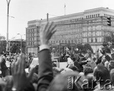 16-23.06.1983, Warszawa, Polska. Druga pielgrzymka Jana Pawła II do Polski. Papież pozdrawia wiernych zgromadzonych przy Nowym Świecie. W tle widoczna jest siedziba Komitetu Centralnego Polskiej Zjednoczonej Partii Robotniczej. Fot. Adam Szymański, zbiory Ośrodka KARTA, kolekcję zdjęć przekazał Adam Szymański