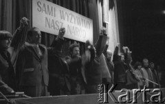 8-9.03.1981, Poznań, Polska. Zjazd zjednoczeniowy NSZZ "Solidarność" RI w gmachu Opery Poznańskiej. (od lewej) NN, NN, NN, Gabriel Janowski, Jan Antoł, Jan Kułaj, Piotr Baumgart, Artur Balazs podnoszą ręce. Za ich plecami napis: "Sami wyżywimy nasz naród". Fot. Lech Ścibor-Rylski, zbiory Ośrodka KARTA/Independent Polish Agency (IPA) przekazał Józef Lebenbaum