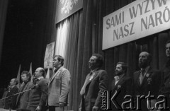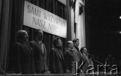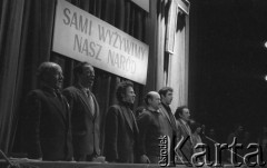 8-9.03.1981, Poznań, Polska. Zjazd zjednoczeniowy NSZZ "Solidarność" RI w gmachu Opery Poznańskiej. (od prawej) NN, Piotr Baumgart, Artur Balazs, NN, Jan Kułaj, Jan Antoł, Gabriel Janowski śpiewają. Fot. Lech Ścibor-Rylski, zbiory Ośrodka KARTA/Independent Polish Agency (IPA) przekazał Józef Lebenbaum