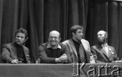 8-9.03.1981, Poznań, Polska. Zjazd zjednoczeniowy NSZZ "Solidarność" RI w gmachu Opery Poznańskiej. Siedzą od lewej: Gabriel Janowski, Jan Antoł, Jan Kułaj i Piotr Baumgart. Fot. Lech Ścibor-Rylski, zbiory Ośrodka KARTA/Independent Polish Agency (IPA) przekazał Józef Lebenbaum