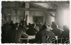 1940, Comisani, Rumunia. Obóz dla internowanych żołnierzy Wojska Polskiego, w Referacie Kulturalno-Oświatowym siedzą od prawej: Artur Szwarcbrot-Malinowicz i Wacław Księski, za nimi stoi Tadeusz Kustanowicz. Fot. NN, zbiory Ośrodka Karta, album (A-XII). Zdjęcie ze zbioru ocalonego przez pracownika ambasady PRL w Bukareszcie Jerzego Polakowskiego