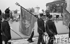 31.05.1981, Warszawa, Polska. Pogrzeb Kardynała Stefana Wyszyńskiego - członkowie Bractwa Kurkowego (Towarzystwa Strzeleckiego) w tradycyjnych strojach ze sztandarem. W tle - Hotel Victoria. Fot. NN, zbiory Ośrodka KARTA/Independent Polish Agency (IPA) przekazał Józef Lebenbaum