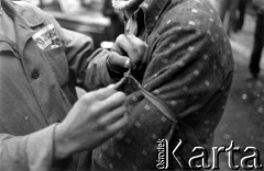 3-5.08.1981, Warszawa, Polska. Kierowcy autobusów miejskich i ciężarówek zablokowali rondo u zbiegu ulic Marszałkowskiej i Alei Jerozolimskich. Protestowali w ten sposób przeciwko obniżce kartkowych przydziałów mięsa i trudnościom zaopatrzeniowym. Strajk został zorganizowany przez Zarząd Regionu NSZZ "Solidarność" Region Mazowsze. Na zdjęciu mężczyzna zawiązuje koledze opaskę strajkową na ramieniu. Fot. Maciej Czarnocki, zbiory Ośrodka KARTA.