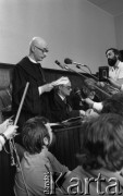 12.05.1981, Warszawa, Polska. Rozprawa sądowa w sprawie rejestracji NSZZ "Solidarność" Rolników Indywidualnych, Jan Kułaj udziela wywiadu dziennikarzom. Po jego prawej stronie siedzi Gabriel Janowski, po lewej Jan Antoł. Fot. Lech Ścibor-Rylski, zbiory Ośrodka KARTA/Independent Polish Agency (IPA) przekazał Józef Lebenbaum