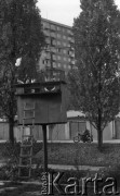 13.10.1979, Gorzów Wielkopolski, woj. gorzowskie, Polska. Osiedle mieszkaniowe - gołębnik. W oddali widoczny jest motocyklista, garaże, drzewa oraz blok mieszkalny. Fot. Jarosław Tarań, zbiory Ośrodka KARTA [79-57]