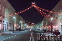 Grudzień 1958, Warszawa, Polska. Aleje Jerozolimskie, w tle neon - choinka na ścianie Centralnego Domu Towarowego "Smyk". Fot. Romuald Broniarek, zbiory Ośrodka KARTA