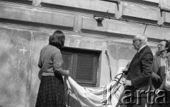 22.04.1981, Warszawa, Polska. Obchody rocznicy Marca '68 na Uniwersytecie Warszawskim - odsłonięcie na ścianie Pałacu Uruskich (Czetwertyńskich) tablicy upamiętniającej wiec studentów domagających się wolności słowa w marcu 1968. Tablicę odsłania profesor Jerzy Pniewski, po prawej stronie stoi Andrzej Walewski. Fot. NN, zbiory Ośrodka KARTA/Independent Polish Agency (IPA) przekazał Józef Lebenbaum