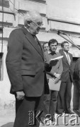 22.04.1981, Warszawa, Polska. Obchody rocznicy Marca '68 na Uniwersytecie Warszawskim - odsłonięcie na ścianie Pałacu Uruskich (Czetwertyńskich) tablicy upamiętniającej wiec studentów domagających się wolności słowa w marcu 1968. Przemówienie Karola Szadurskiego. Na drugim planie stoją, od prawej strony: Kazimierz Dobrowolski i profesor Henryk Samsonowicz. Fot. NN, zbiory Ośrodka KARTA/Independent Polish Agency (IPA) przekazał Józef Lebenbaum
