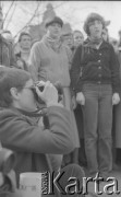 22.04.1981, Warszawa, Polska. Obchody rocznicy Marca '68 na Uniwersytecie Warszawskim - odsłonięcie na ścianie Pałacu Uruskich (Czetwertyńskich) tablicy upamiętniającej wiec studentów domagających się wolności słowa w marcu 1968. Chór akademicki śpiewa Gaudeamus igitur. Na pierwszym planie fotoreporterka robi zdjęcie. Fot. NN, zbiory Ośrodka KARTA/Independent Polish Agency (IPA) przekazał Józef Lebenbaum