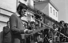 22.04.1981, Warszawa, Polska. Obchody rocznicy Marca '68 na Uniwersytecie Warszawskim - odsłonięcie na ścianie Pałacu Uruskich (Czetwertyńskich) tablicy upamiętniającej wiec studentów domagających się wolności słowa w marcu 1968. Przemówienie Macieja Gellera. Na drugim planie widoczni są: profesor Jerzy Pniewski (w okularach, drugi od prawej) i Kazimierz Dobrowolski (stoi po lewej stronie profesora). Fot. NN, zbiory Ośrodka KARTA/Independent Polish Agency (IPA) przekazał Józef Lebenbaum