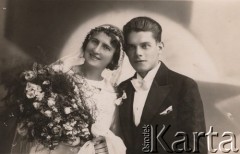 1937, Sosnowiec, Polska. Fotografia ślubna Stefana i Wiktorii Konop, z domu Marzec. Fot. NN, zbiory Ryszarda Konopa, reprodukcje cyfrowe w Ośrodku KARTA w Warszawie i w Instytucie Polskim i Muzeum im. gen. Sikorskiego w Londynie.