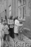 3.06.1997, Gniezno, Polska. Miasto w czasie wizyty Ojca Świętego Jana Pawła II. Kobiety przy graffiti: "Dość żydo-komuny. Falango wróć". Fot. Jerzy Szot, zbiory Ośrodka KARTA