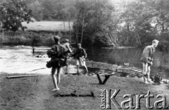 24.07.1944, Puszcza Nacka, okolice Jocz, pow. Wileńsko-Trocki. Oddział partyzancki Bazy z Kedywu Komendy Okręgu Wileńskiego AK. Biwak nad rzeką Wohubką na przeciwko Jocz. Suczenie ubrań, jedzenie i odpoczynek po wyczerpującym nocnym marszu. Fot. Zygmunt Zniszczyński, zbiory Ośrodka KARTA, kolekcja BAZY-MIÓD [sygn. 7/19?]
