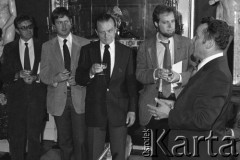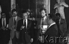 6.06.1981, Warszawa, Polska. Wizyta Czesława Miłosza w Polsce po otrzymaniu Literackiej Nagrody Nobla - spotkanie z poetą w Pałacu na Wodzie w Łazienkach Królewskich. Od lewej strony stoją - brat pisarza, Andrzej Miłosz, Piotr Miłosz (syn pisarza), Czesław Miłosz i Antoni Miłosz (syn pisarza). Na pierwszym planie (bokiem) stoi Józef Tejchma, minister kultury i sztuki. Fot. NN, zbiory Ośrodka KARTA/Independent Polish Agency (IPA) przekazał Józef Lebenbaum