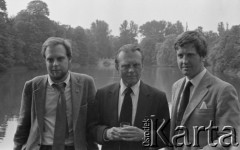 6.06.1981, Warszawa, Polska. Wizyta Czesława Miłosza w Polsce po otrzymaniu Literackiej Nagrody Nobla - poeta z synami Antonim (na lewo) i Piotrem przed Pałacem na Wodzie w Łazienkach Królewskich. Fot. NN, zbiory Ośrodka KARTA/Independent Polish Agency (IPA) przekazał Józef Lebenbaum