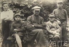 Lata 30-te, Brześć nad Bugiem, Polska. Rodzina w ogrodzie. Od lewej stoją Irena Skorupska, Ferdynand Skorupski, Władysław Skorupski, siedzą: Kazimierz Skorupski i Feliksa Skorupska. Fot. NN, zbiory Ośrodka KARTA, album rodziny Skorupskich udostępniła Agata Witerska