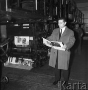 1968, Warszawa, Polska. Dwudziestolecie drukarni RSW "Prasa", mężczyzna przy maszynach drukarskich czytający gazetę. Fot. Romuald Broniarek/KARTA