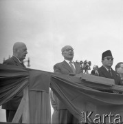 21.07.1959, Warszawa, Polska. Akademia w przeddzień piętnastolecia PRL, fragment trybuny honorowej, czwarty od lewej stoi I sekretarz KC KPZR Nikita Chruszczow, za nim przewodniczący Rady Państwa Aleksander Zawadzki, NN, premier Józef Cyrankiewicz. Fot. Romuald Broniarek/KARTA