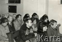 10.10.1979, Warszawa, Polska. Msza św. odprawiona przez księdza Jana Zieję na zakończenie głodówki solidarnościowej członków i sympatyków Komitetu Samoobrony Społecznej KOR (KSS KOR) w kościele Św. Krzyża w obronie więźniów politycznych w Czechosłowacji oraz aresztowanych Polaków: Adama Wojciechowskiego i Edmunda Zadrożyńskiego. W pierwszym rzędzie siedzą: Anka Kowalska i Jacek Bierezin; w drugim: Jan Lityński, Joanna Duda-Gwiazda, Konrad Bieliński, Jacek Kuroń; w trzecim: NN, NN, Adam Michnik, Jerzy Markuszewski, Antoni Macierewicz. Fot. NN, kolekcja Jacka Kuronia, zbiory Ośrodka KARTA