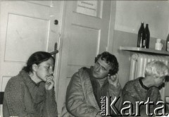 3-10.10.1979, Warszawa, Polska. Głodówka solidarnościowa członków i sympatyków Komitetu Samoobrony Społecznej KOR (KSS KOR) w kościele Św. Krzyża w obronie więźniów politycznych w Czechosłowacji oraz aresztowanych Polaków: Adama Wojciechowskiego i Edmunda Zadrożyńskiego. Siedzą od lewej: Joanna Duda-Gwiazda, Adam Michnik, Halina Mikołajska. Fot. NN, kolekcja Jacka Kuronia, zbiory Ośrodka KARTA.