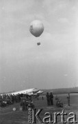 1948, Katowice, Polska. Ogólnopolskie Zawody Modeli Latających, publiczność obserwująca balon Ligi Lotniczej, w tle samolot Polskich Linii Lotniczych LOT. Fot. Kazimierz Seko, zbiory Ośrodka KARTA