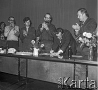 31.08.1980, Warszawa, Polska. Podpisanie porozumienia po zakończeniu strajku hutników w Hucie Warszawa. W środku stoi Seweryn Jaworski (w okularach). Pierwszy od lewej stoi Karol Szadurski. Fot. Adam Szymański, zbiory Ośrodka KARTA, kolekcję zdjęć przekazał Adam Szymański