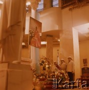 Przed 3.11.1984, Warszawa Żoliborz, Polska. Porwanie księdza Jerzego Popiełuszki. Poczet sztandarowy hutników podczas czuwania w kościele św. Stanisława Kostki, z lewej wisi portret księdza Popiełuszki. Fot. Krzysztof Burnatowicz, zbiory Ośrodka KARTA.