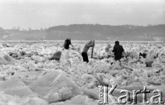 Marzec 1979, Wyszków okolice, woj. Ostrołęka, Polska. Ewakuacja ludności z terenów objętych powodzią. Kobieta i mężczyzna opuszczają podtopione domostwo. W oddali widoczny jest most na rzece Bug. Fot. Jarosław Tarań, zbiory Ośrodka KARTA [79-24]