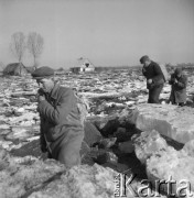 Marzec 1979, Wyszków okolice, woj. Ostrołęka, Polska. Pracownicy pogotowia technicznego wyciągają z wody samochód ciężarowy. Fot. Jarosław Tarań, zbiory Ośrodka KARTA [79-24]
