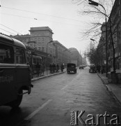Listopad 1968, Warszawa, Polska. Otwarcie przebudowanego fragmentu ulicy Marszałkowskiej. Panorama ulicy - samochody, tramwaje, przechodnie, w oddali widoczne są wieże Kościoła Najświętszego Zbawiciela. Fot. Jarosław Tarań, zbiory Ośrodka KARTA
